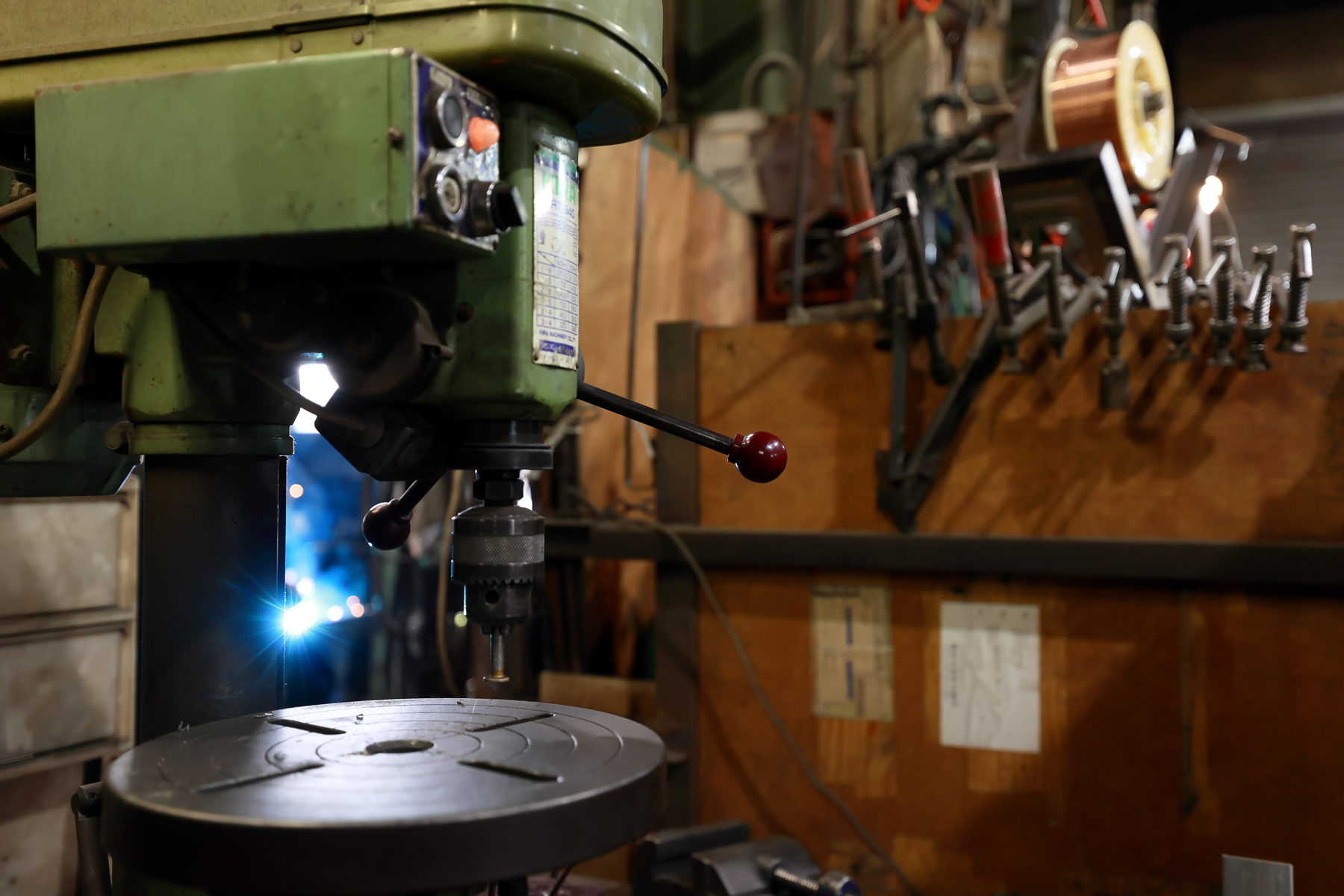 回転するドリルをハンドルで昇降させて加工物に穴あけ加工を行うのが、卓上型のボール盤です。